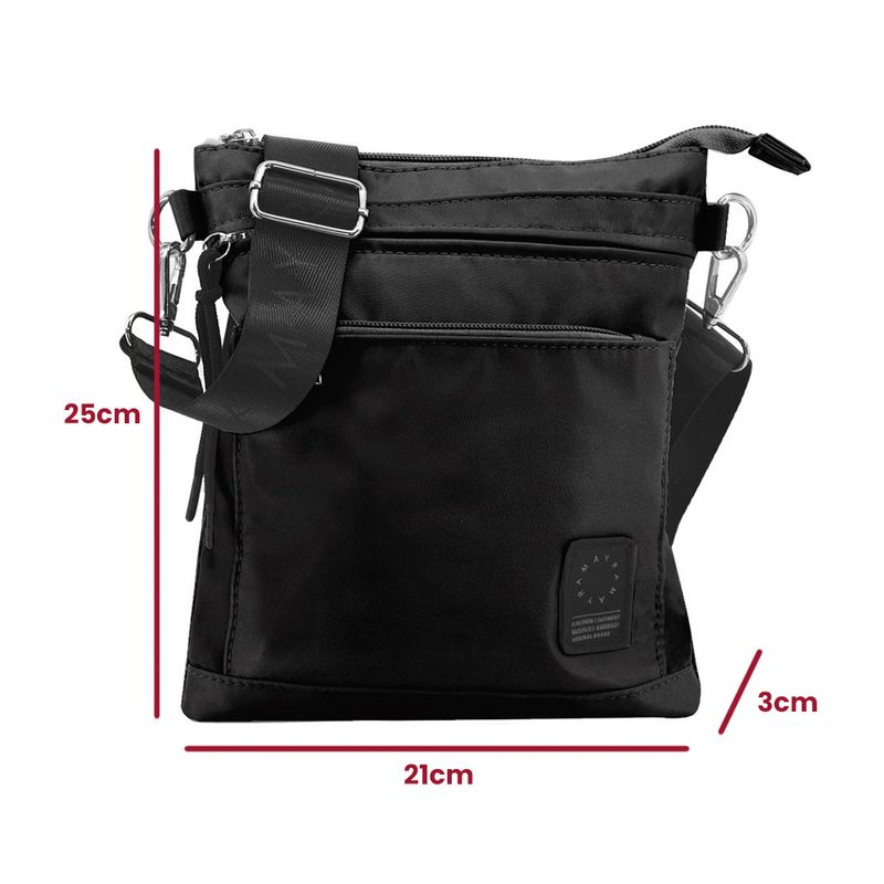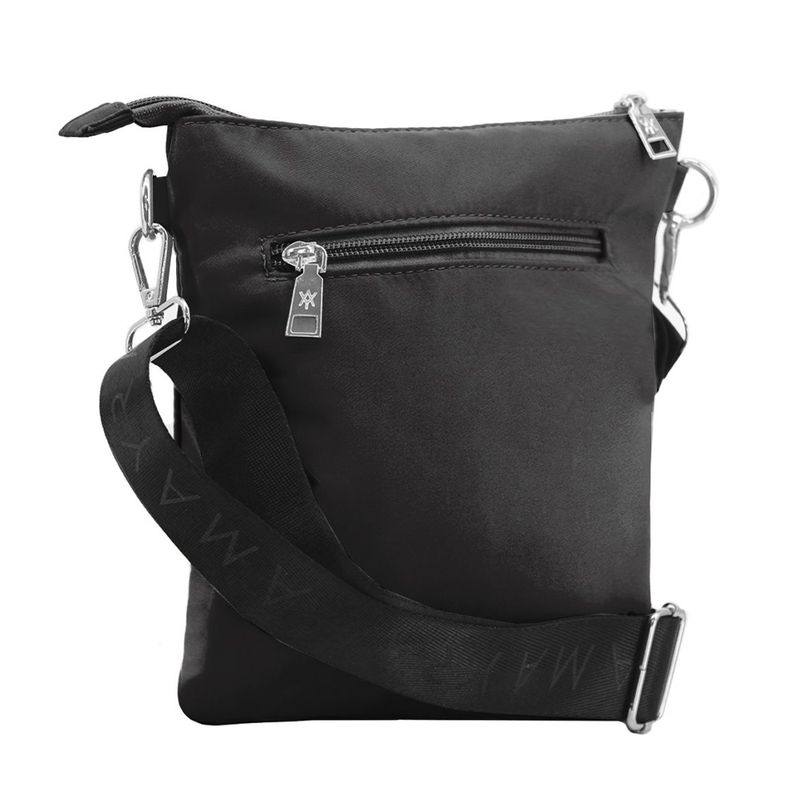 Características: - Una división – Interior forrado – Bolsillo interno con cierre – Dos bolsillos frontales con cierre, uno de ellos de tipo oculto – Bolsillo en el dorso con cierre – Tira extraíble y extensible hasta 126 cm – Herrajes plateados – Material: microfibra – Medidas aproximadas: alto 25 cm, x ancho 21 cm, x profundidad 3 cm -