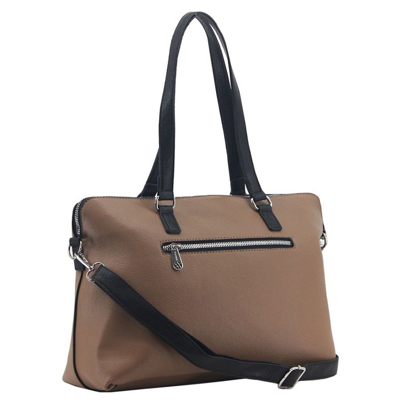 Características:  Una división – Interior forrado – Dos bolsillos internos abiertos y otro con cierre – Bolsillo frontal con solapa de apertura mediante botón imantado – Bolsillo en el dorso con cierre – Manija doble de 53 cm cada una – Tira extraíble y extensible hasta 122 cm – Cierres y herrajes plateados – Material: PU – Medidas aproximadas: alto 27 cm, x ancho 38 cm, x profundidad 13 cm