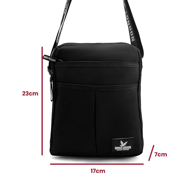 Características: - Dos divisiones – Interior forrado – Bolsillo interno abierto – Bolsillos frontales, uno con cierre y el otro abierto – Aplique frontal engomado con logo de la marca – Correa estampada extensible hasta 143 cm – Material: microfibra – Medidas aproximadas: alto 23 cm, x ancho 17 cm, x profundidad 7 cm -