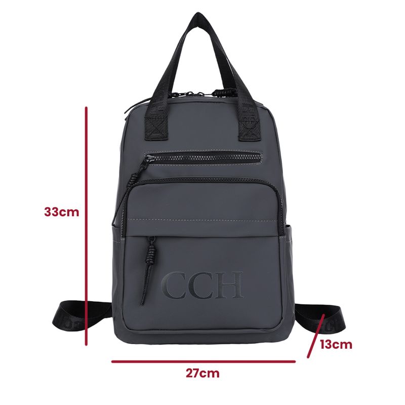 Características: - Una división – Interior forrado – Tres bolsillos frontales con cierre – Bolsillo abierto en cada lateral – Doble manija de 37 cm cada una – Tiras extensibles hasta 85 cm cada una – Material: PU – Medidas aproximadas: alto 33 cm, x ancho 27 cm, x profundidad 13 cm
