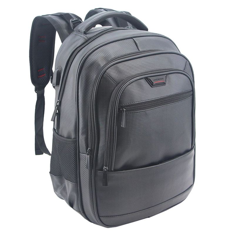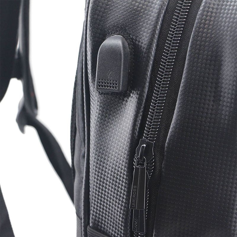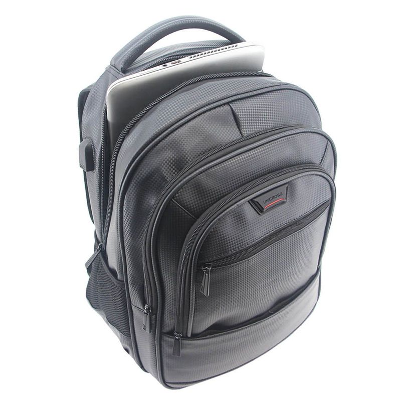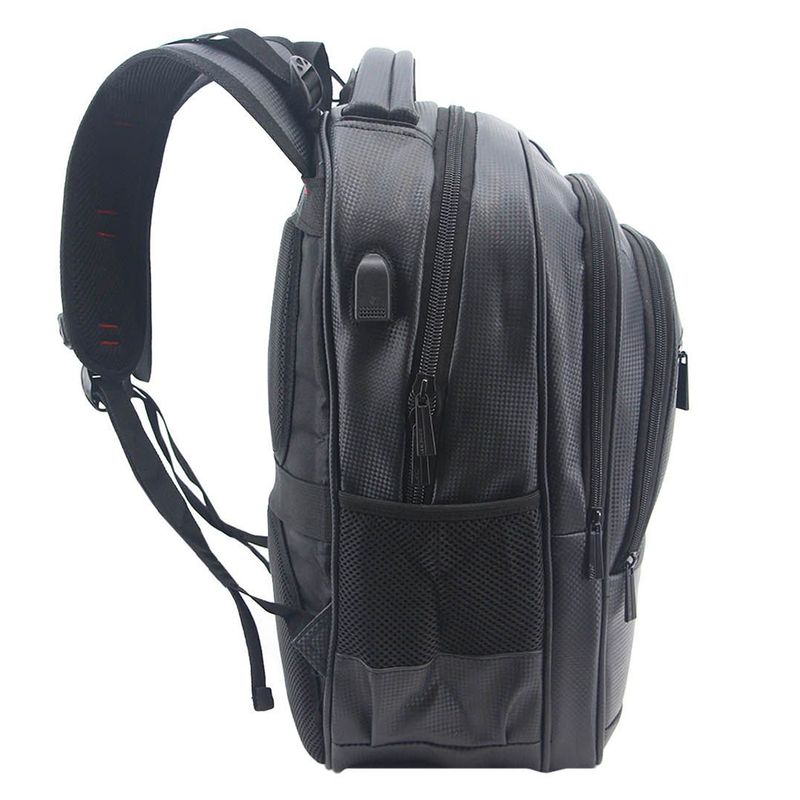 Mochila porta notebook confeccionada en eco cuero. Presenta 3 divisiones de diferente capacidad, bolsillo con cierre en su frente y 2 bolsillos laterales en red con ajuste elástico. Espalda reforzada y acolchonada con ventilación y al igual que sus correas las cuales son regulables. 2 asas superiores de agarre una acolchonada y otra confeccionada en tela. Cierres gruesos y resistentes.