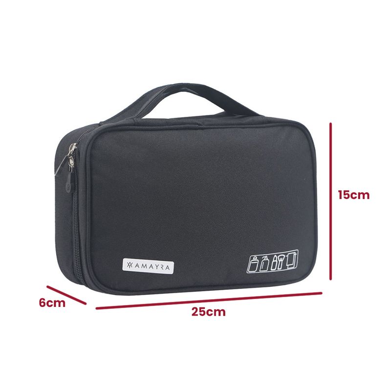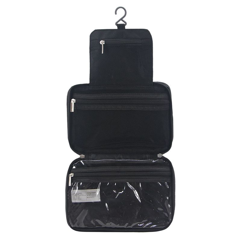 Características: - Una división - Interior forrado - Formato extensible - En Apertura brinda percha superior, tres bolsillos internos, dos de red y el otro de PVC transparente impermeable - Manija lateral - Frente sublimado con logo de la marca - Material: poliéster - Medidas aproximadas: alto 15 cm, x ancho 25 cm, x profundidad 6 cm -