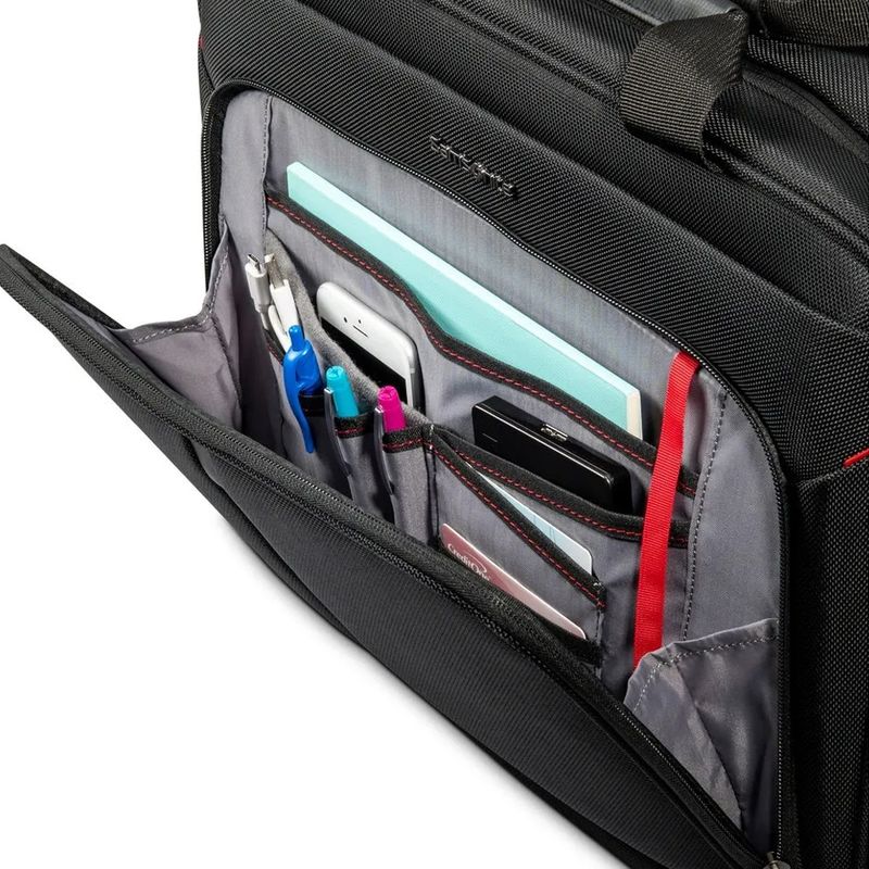 Características: - Una división – Interior forrado – Compartimiento porta notebook o dispositivo - Bolsillo frontal con cierre y organizador interno – Doble manija superior – Correa extraíble y extensible – Tira en el dorso para equipaje – Material: poliéster – Medidas aproximadas: alto 31 cm, x ancho 43 cm, x profundidad 15 cm -